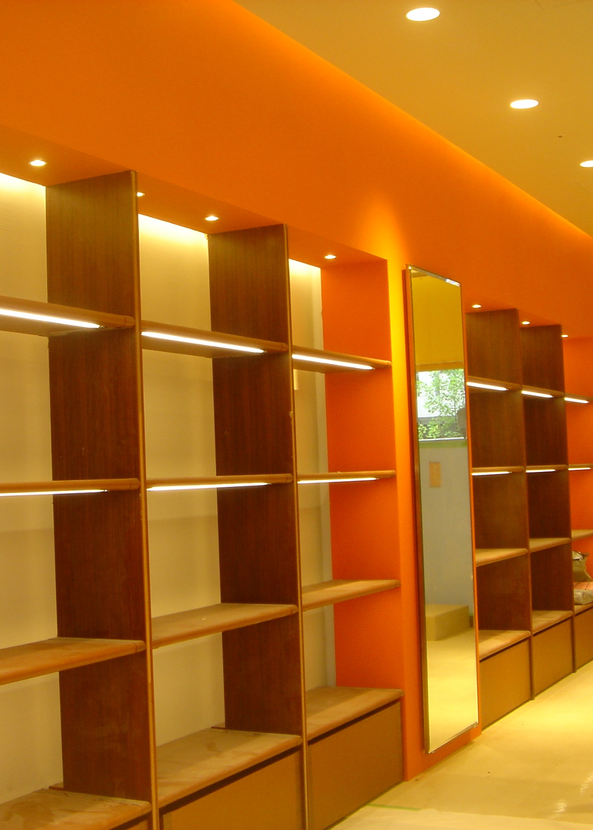 材料でいうと、住宅の施工ではありえないような耐久性の低い素材でも、どんどん使えます。材料による制約がないので、どんなデザインでも実現できるのが、内装施工の面白さの一つ。既製品にとらわれず、ディスプレイ用の棚も、木工所にオーダーメイドで作ってもらうこともありますよ!
